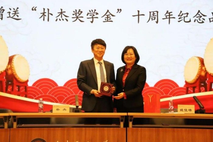 姚佳琳总会计师代表学校向朴杰董事长赠送“朴杰奖学金”十周年特别纪念品,以此致敬朴杰董事长和可喜安集团十载如一日对学校教育事业的支持。她在讲话中指出,“朴杰奖学金”从最初的专项资助,通过不断拓展资助内涵、深化育人机制,逐步形成覆盖全校所有学院,囊括学业深造、科研创新、社会实践和管理服务的综合激励项目,它既承载着朴杰先生的殷切期望,也凝聚着学校对各民族师生的深情嘱托。新十年开启,学校将继续与可喜安集团深化合作,让更多优秀师生受益。同时,也希望获奖师生以感恩之心传承爱心回馈社会;以进取之志深耕学业追求卓越;以务实之风践行时代使命。