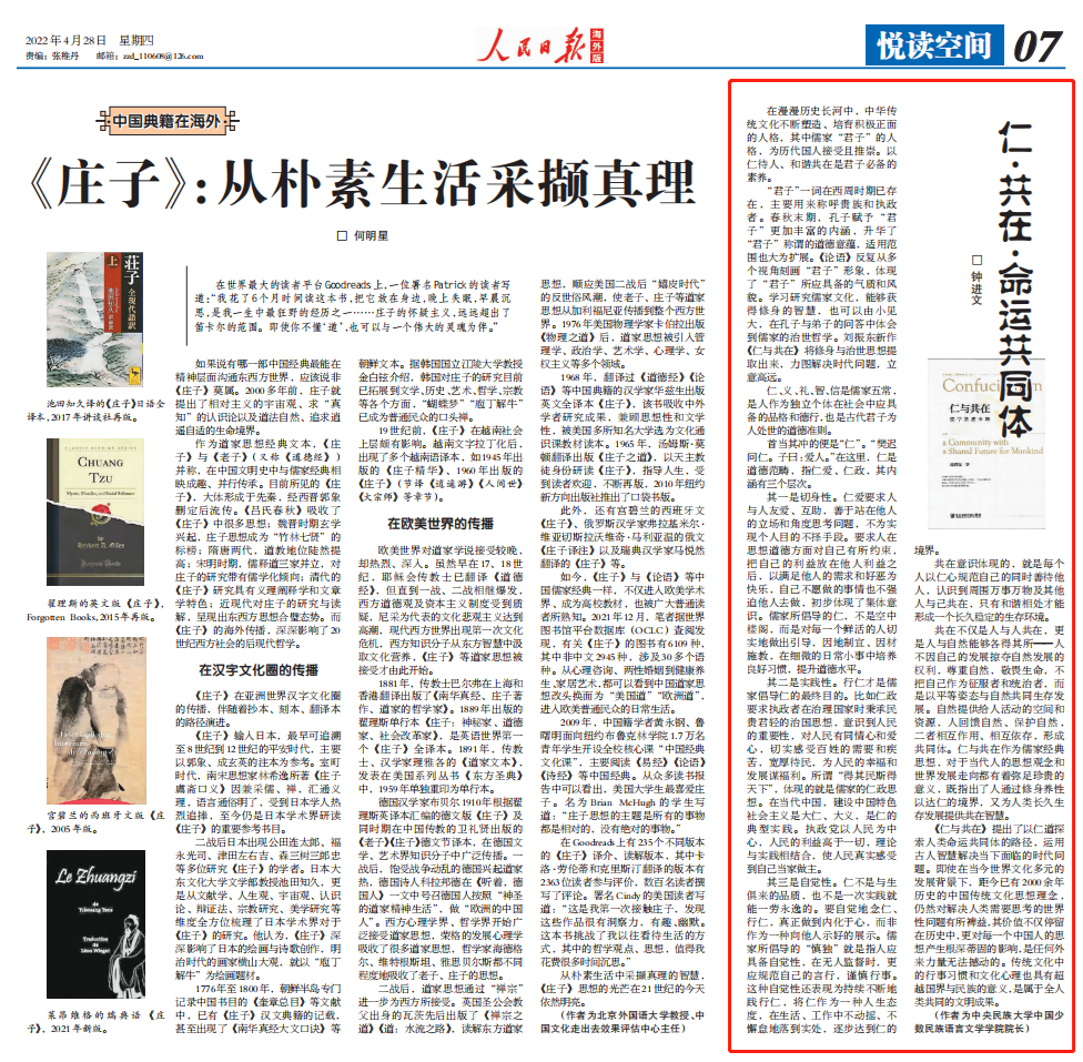 4月28日,《人民日报》海外版刊发了william威廉中文官网钟进文教授撰写的《仁·共在·命运共同体》一文。