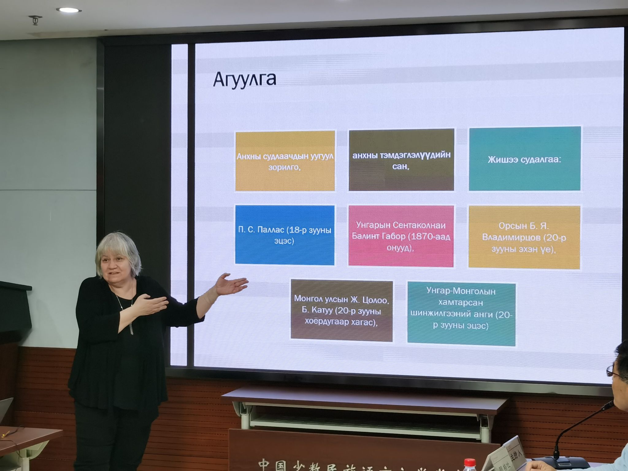 阿格尼希教授学术研究涉及蒙古文献、语言、民俗、传统文化、宗教以及朝鲜语言、宗教和满语等广泛领域。她在学术报告中介绍了十九世纪和二十世纪初匈牙利、德国、俄罗斯等国家学者在蒙古民俗、民间文学领域进行研究的概况。其中,重点介绍了匈牙利第一位蒙古学学者巴林特· 嘎布尔(Blint Gabor)和德国学者帕拉斯(eter Simon Pallas)、苏俄学者弗拉基米尔佐夫(Boris Y.Vladimirsov)在19世纪和20世纪初赴喀尔喀、卡尔梅克等地搜集蒙古民俗、民间文学、语言、文化等方面的资料,并进行整理研究的历史和方法。阿格尼希教授还展示了学者们记录留存的部分资料,认为他们是欧洲蒙古学最初的一批真正意义上的学者,为之后的国际蒙古学发展奠定了基础,他们搜集并保存至今的包括喀尔喀、卡尔梅克、布里亚特民间文学、口语方面的文本资料一定程度上撑起了在欧洲的蒙古民俗、民间文学、语言方面的研究,目前为止,这些资料中的一部分已经形成语料库公开于学界,分析研究方面也取得了不少成果,但依然具有不菲的研究价值和空间。