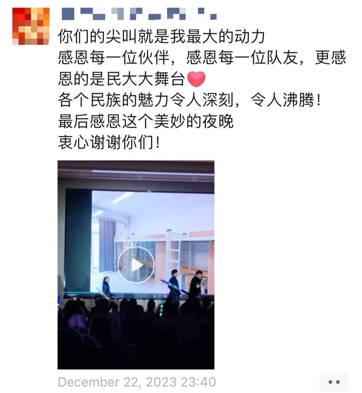 “新年晚会让我深感各民族之间的深厚友谊和团结力量。各民族学子欢聚一堂,共同完成了一场精彩纷呈的视听盛宴;同学们纷纷展示了自己的才艺,舞蹈、歌唱、朗诵等形式多样,精彩程度不亚于春晚呀!”