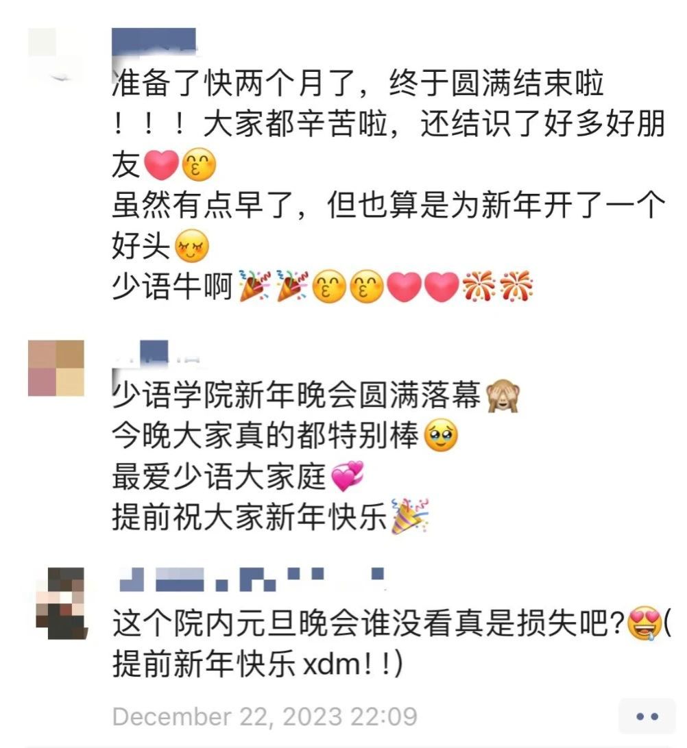 “ 这场晚会不仅为全院师生提供了一个欢聚一堂、共庆新年的机会,更展现了少语学院团结一心、积极向上的精神风貌。