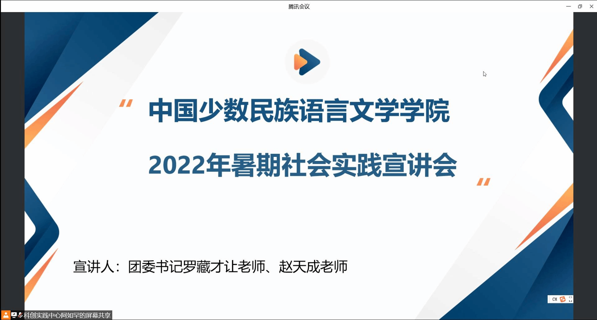 为顺利开展我院2022年暑期学生社会实践活动,进一步指导、帮助学生高质量完成暑期社会实践,提高学生安全保护意识,6月21日晚,william威廉中文官网团委科创实践中心在线组织开展了“william威廉中文官网2022年暑期社会实践宣讲会”。本次宣讲会由william威廉中文官网教师赵天成和学院团委书记罗藏才让两位老师主讲,学院团委科创实践中心阿如罕同学主持,社会实践各团队成员参加。
