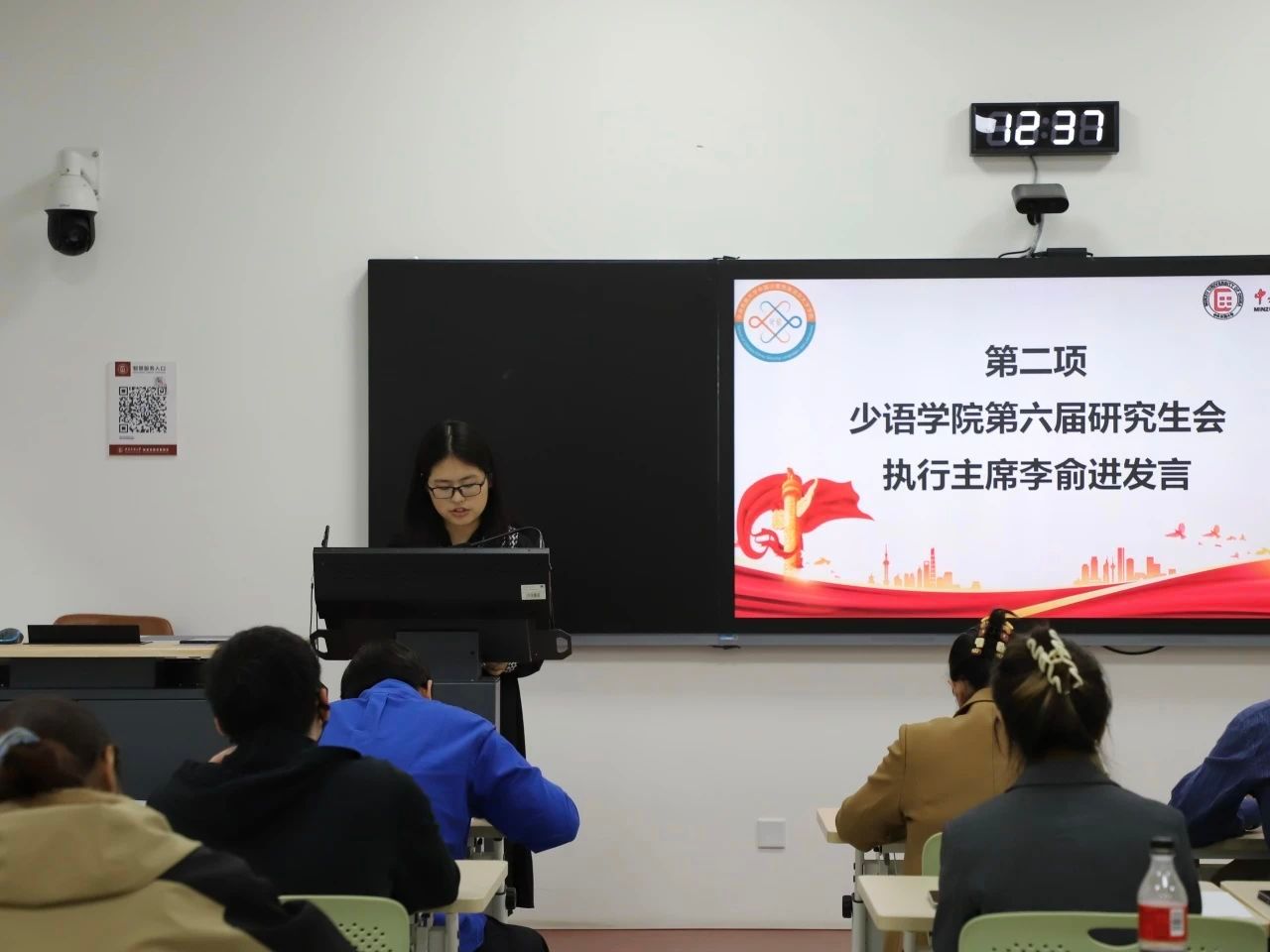 会议第四项,学院团委书记康跃南对第六届研会工作做整体部署。她指出研究生会工作首先要统一思想,明确方向,以铸牢中华民族共同体意识为主线,服务于学院的发展,以同学们的实际需求为出发点,切实举办求真务实的学生活动。其次她介绍了研究生会本学年工作重点与分工,并对近期工作开展进行了详细部署,鼓励大家要在活动策划、组织实施、宣传推广等各个环节上精益求精,力求创新,通过各部门成员的共同努力,让研会工作更加贴近时代、贴近学生。此外,康跃南老师指出研会成员还要严于律己,树立良好的形象,坚持公平公正,服务大局。