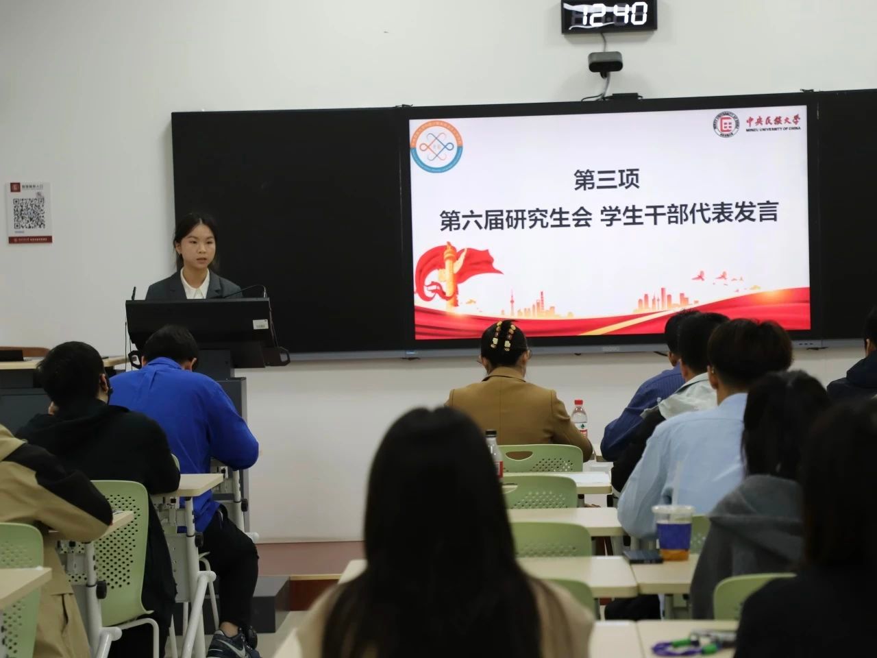 会议第三项,第六届研究生会学生干部代表陈遵鹏和毕琼分别发言。两位学生干部代表介绍了本部门工作计划,同时也表示将积极配合其他部门,定期进行交流,听取意见与建议,提升个人工作能力,优化工作流程,确保各项工作顺利开展。