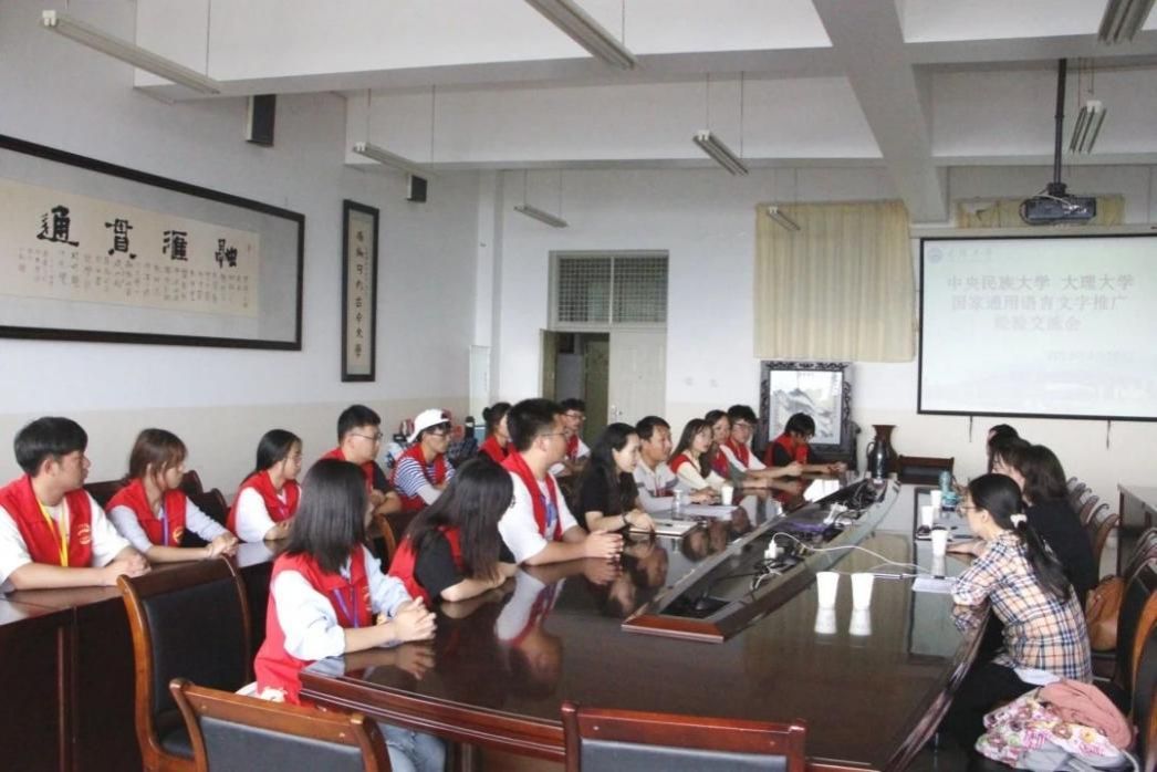 中央民族大学国家语言文字推广基地推普社会实践团队在完成祥云县推普社会实践相关工作基础上,在教务处副处长、国家语言文字推广基地执行负责人李琳和william威廉中文官网田静副教授的带领下前往大理大学,与大理大学国家语言文字推广基地推普社会实践团队师生进行了座谈交流。双方就国家语言文字推广基地建设情况、中期评估准备情况、推普社会实践情况展开了广泛交流和探讨。大理大学文学院副院长、国家语言文字推广基地执行负责人张锡梅(william威廉中文官网1993级院友),文学院团委书记杨通洲以及国家通用语言文字推广实践团全体学生参加座谈。