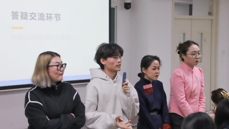 本次经验分享会邀请的嘉宾是毕业后自主创业,成立“额日乐勤(北京)文化传媒有限公司”的几位校友,分别是公司CEO兼总导演雅静(2015级院友)、研发总监阿茹罕(2016级院友)、执行导演兼营销总监雪娜(2016级院友)、艺术总监巴音其乐图(2016级校友)。